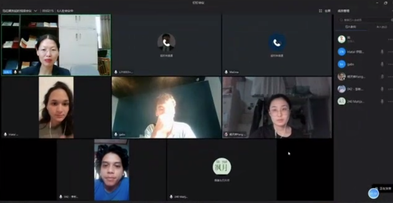 国际中文教育系范红娟老师讲授的《基础汉语》课程面向非汉族语言班的选修留学生开课,授课对象包括海外留学生。范老师通过“钉钉”平台进行教学,将学生分组,课前确定课堂任务,学生自主学习下节课的内容,并在课前完成小组合作对话视频。课上有导学-学生对话练习(过程中老师点拨)-词汇、语法点讲解-学生练习等活动形式。