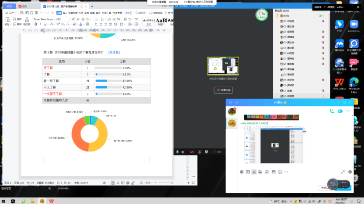 卢敏老师所教授的《英语短篇小说阅读》是英语专业的专业必修课,在疫情下,采用QQ分享屏幕开展线上教学。课程本采用线上线下教学模式,教学方法上变化比较小。在第一次在线教学前,采用问卷星形式了解学生对该课程内容的期望、学习方法、学习时间以及学习能力培养等相关信息,清楚学情,并把握学生对课程的了解程度以及教学内容的调整。介绍课程大纲、课程的基本要求、评价方式等。学生积极参与课堂讨论,基本上做到不受疫情影响,实现教与学的线上有效融合。