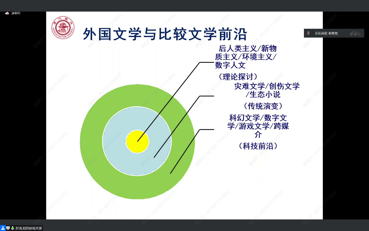 彭教授指出,科技进步给人类社会和世界发展带来了重大变化,人类机器化、机器人类化的伦理法治问题对工作方式、生活方式、思维方式等方面带来巨大冲击。彭教授认为,当前翻译学的研究应以国际传播为核心,讲述好中国发展的故事和党的故事;在外国文学与比较文学领域,从后人类主义、新物质主义的理论探讨到灾难文学、创伤文学的传统演变,进而扩展到游戏文学等科技话题,都是文学研究应当关注的学术前沿。国别区域研究则可以从大国关系和一带一路等角度出发,进行针对性的、深入的研究。彭教授结合量子力学等学科知识拓展了外语教学和研究的外延,树立了科学技术对文学创作、文学理论和文学批评等领域带来的全方位影响,并提出了新的研究范式。