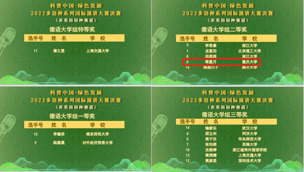 2022年12月17日,“科普中国•绿色发展2022多语种系列国际演讲大赛”决赛圆满落幕。此次比赛吸引了来自国际以及国内大、中院校多语种(英语、德语、俄语、法语、西班牙语、日语)超百位大学生、中学生参赛。经过初赛的激烈角逐,我院德语系高年级本科生蒋星月从德语大学组的激烈角逐中脱颖而出,最终斩获决赛全国二等奖。