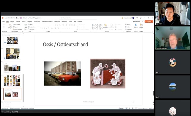 针对本学期线上教学实际需要,德语系创新课程教学模式,整合校内外资源,以本科三四年级“高级德语”系列课程以及二年级“德语国家概况”课程为基础,分别在2022年11月7日和11月14日下午,开展了两次线上教学。这两次教学活动的主题是“德国哲学与文化”,由本校教师毛亚斌和潘玲及邀请到的德国专家克里斯托夫·麦嘉教授联合讲授,我校德语专业各年级学生及其他感兴趣的师生参与了上述教学活动。