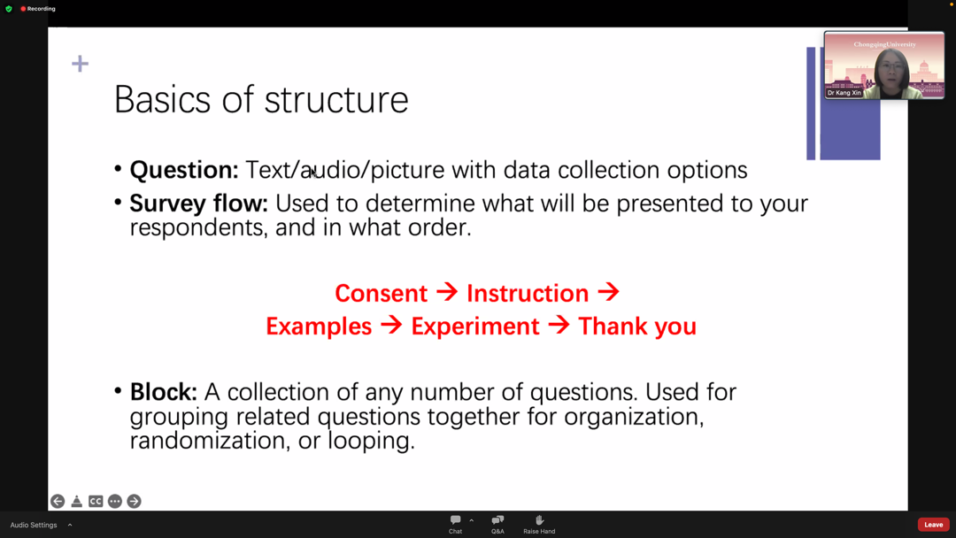 近年受疫情影响,在线实验工具广受热议,康鑫教授已有超过十年的使用经验,她以近期发表的研究成果和正在进行的研究项目为例,分享在线研究工具在语言数据收集和处理的实际应用及其特点,重点讲解Qualtrics、Gorilla和腾讯会议三款工具。讲座伊始,康鑫教授从Qualtrics用户界面开始,讲解研究常用的反应计时、屏幕强制停留等功能,分享了搭配使用编程语言进行媒体文件预加载和干扰信息隐藏处理等小技巧。她讲述了与荷兰鹿特丹大学的Rolf Zwaan教授、香港中文大学黄俊文教授等合作者使用Qualtrics和MTurk采集成年人语言加工数据的经验。康鑫教授也分享了色情影片