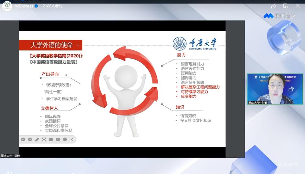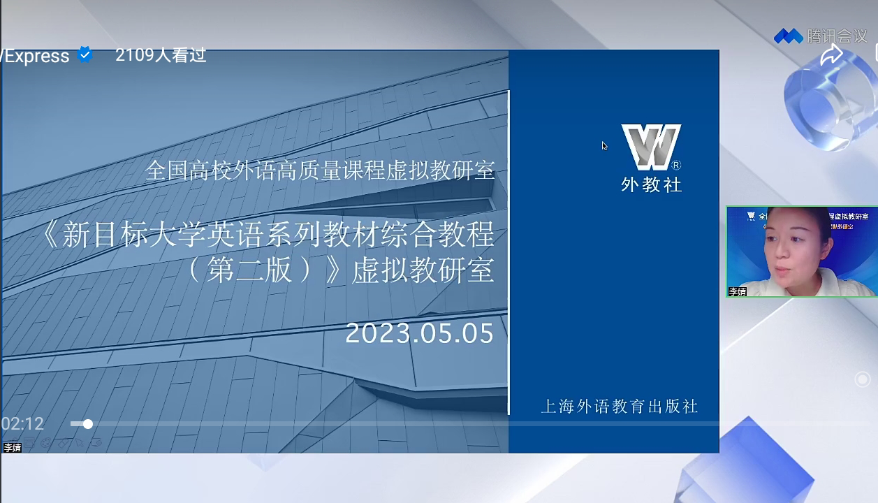 5月5日晚,由上海外语教育出版社承办、我院大学英语电气信息课程组主讲的全国高校外语高质量课程虚拟教研室之《新目标大学英语系列教材综合教程(第二版)》虚拟教研室活动第二场通过腾讯会议在线成功举办。2000多名来自全国各大高校的大学英语教师相聚云端,共享虚拟教研盛会。本次活动由外教社李婧老师主持,主题是“新工科大类创新人才培养:大学英语课程思政案例分享”,主讲嘉宾为色情影片