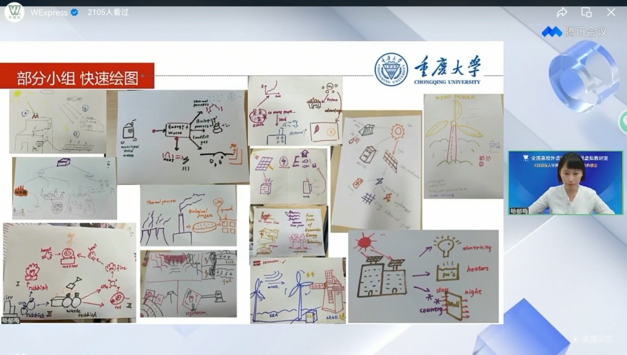 然后,杨郁梅副教授根据新工科人才素养和大学英语能力培养要求,以第四册第五单元Renewable and Sustainable Energy为例,基于情感、认知、行为的“教学设计三问”,提出思政融入课程要以学生的成长、成人、成才为目标和检验标准。她通过课前学情分析,将单元主题接近的新能源单元和动物保护单元融合,鼓励学生通过学习实践向科学家榜样致敬。适时切入留华学生参与中国水周背景,激励学生以问卷调查形式宣传可持续发展的重要性;组织学生调查汇报色情影片