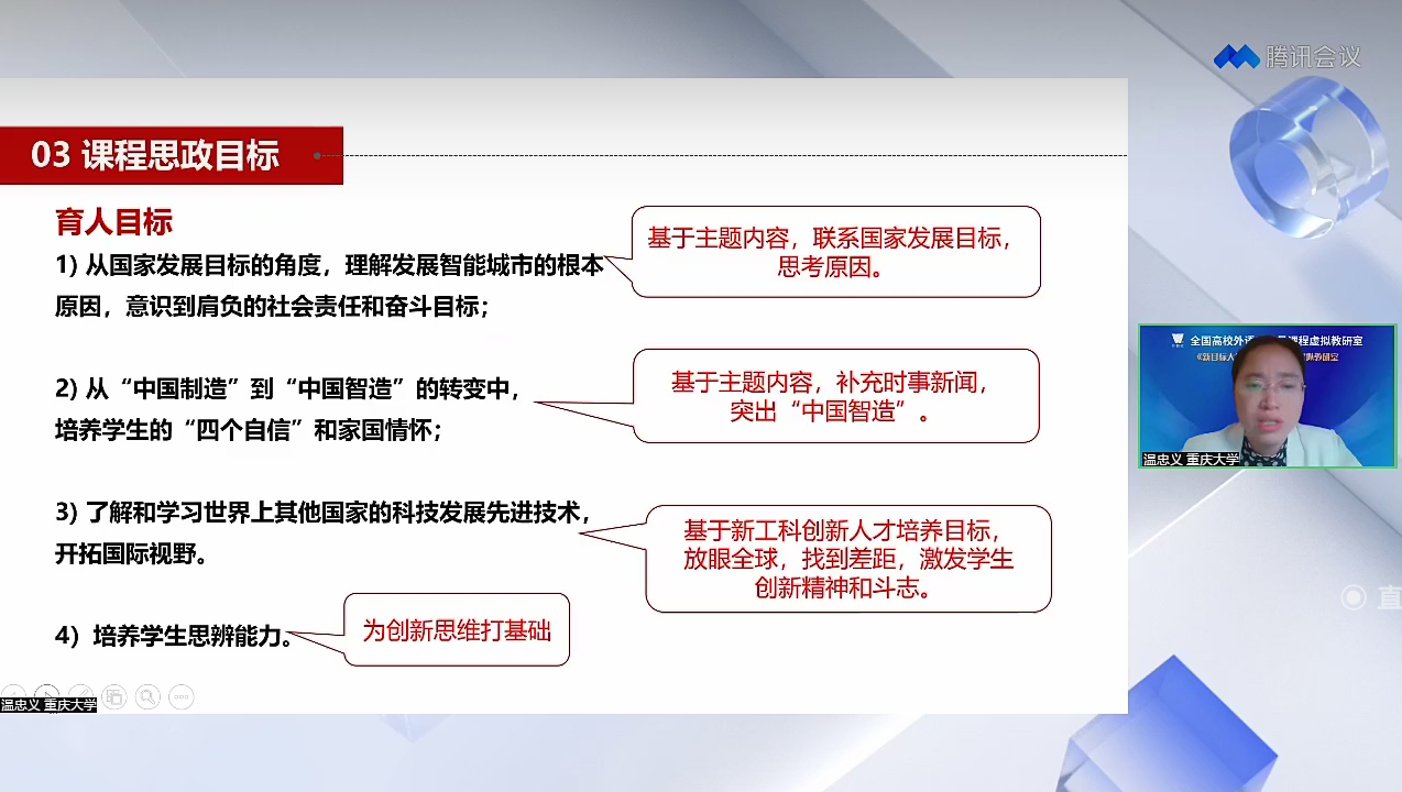 接着,温忠义副教授结合新工科创新人才培养要求,指出大学英语课程思政具有培养创新思维、突出国际化、转变学习方式、看重人文素养的特点,分享了内容为本、适时切入;过程循环、点面结合;方法柔性、润物无声;行为激发、产生效果的具体思政融入课程实操理念。期待大学英语课程能够在思政引领为国家服务、提供国际化工具、提高终身学习能力、以及培养人文社会科学素养等多方面、全方位提供学生成长成才的支撑和引导。她以《新目标大学英语综合教程》(第二版)第二册第三单元为例,围绕Smart Technology, Smart Life的单元主题和内容,认真分析学生善于学习使用信息技术的学情,设定四个课程思政教学目标:1.从国家发展目标的角度,理解发展智能城市的根本原因,意识到肩负的社会责任和奋斗目标;2.从“中国制造”到“中国智造”转变中,培养学生的“四个自信”和家国情怀;3.了解和学习世界上其他国家的科技发展先进技术,开拓国际视野;4.培养学生思辨能力。温老师结合具体教学活动,将思政内容如何从由点到面,再到点面结合的教学案例娓娓道来,学生积极沉浸于教学活动中,夯实语言基础的同时,通过一个又一个从易到难循序渐进的项目成果,达成综合能力提升。其中展示的学生制作AI海报、思维导图、ChatGPT使用实操体验都让人耳目一新。尤其提出“中国制造”到“中国智造”质性提升的概念让学生们自豪感油然而生、信心满满。