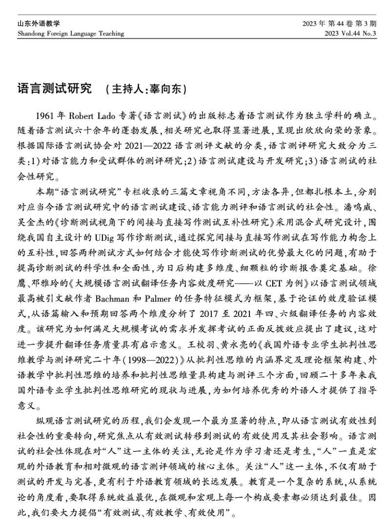 学报》“语言测试”专栏主持人语中,辜向东辜教授以“语言测评素养”概念为引入,从实践、原则和环境三个层面为主线点评了第5期“语言测试研究”专栏的三篇文章。在《山东外语教学》第3期的“语言测试”专栏主持人语中,辜向东教授先概述了语言测试六十年的发展历程,而后点评专栏的三篇文章,并对未来语言测试研究的焦点进行展望。