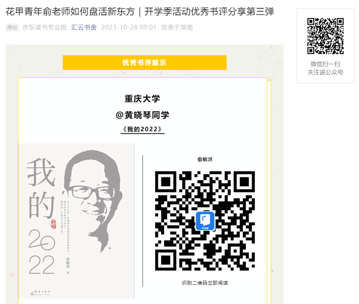 语言认知及语言应用研究基地辜向东教授团队2022级博士生黄晓琴参与京东读书汇云博图举办的开学季阅读活动,其《我的2022》(俞敏洪著)读后感于10月28日被评为第三期优秀书评,发表于“汇云书舍”微信公众号和京东读书专业版平台(阅读量1126次,10月29日)。
