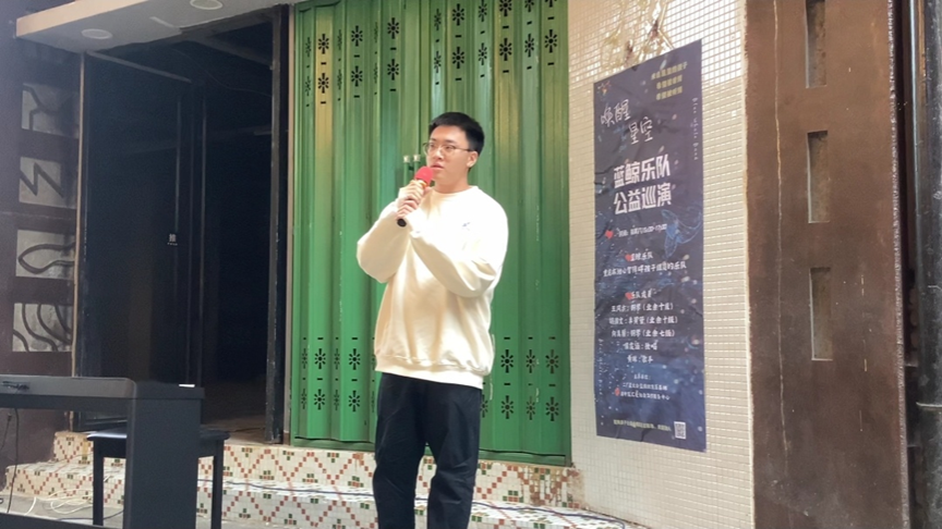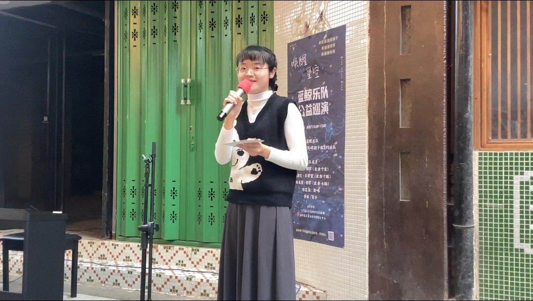 2023年10月28日,语言科学与障碍康鑫团队成员张雅倩、赵巧尧带领陈璇驰等志愿者前往鹅岭二厂下沉广场开展重庆“汇爱”蓝鲸乐队演出的志愿服务,承担主持节目、助演、现场宣传等任务。