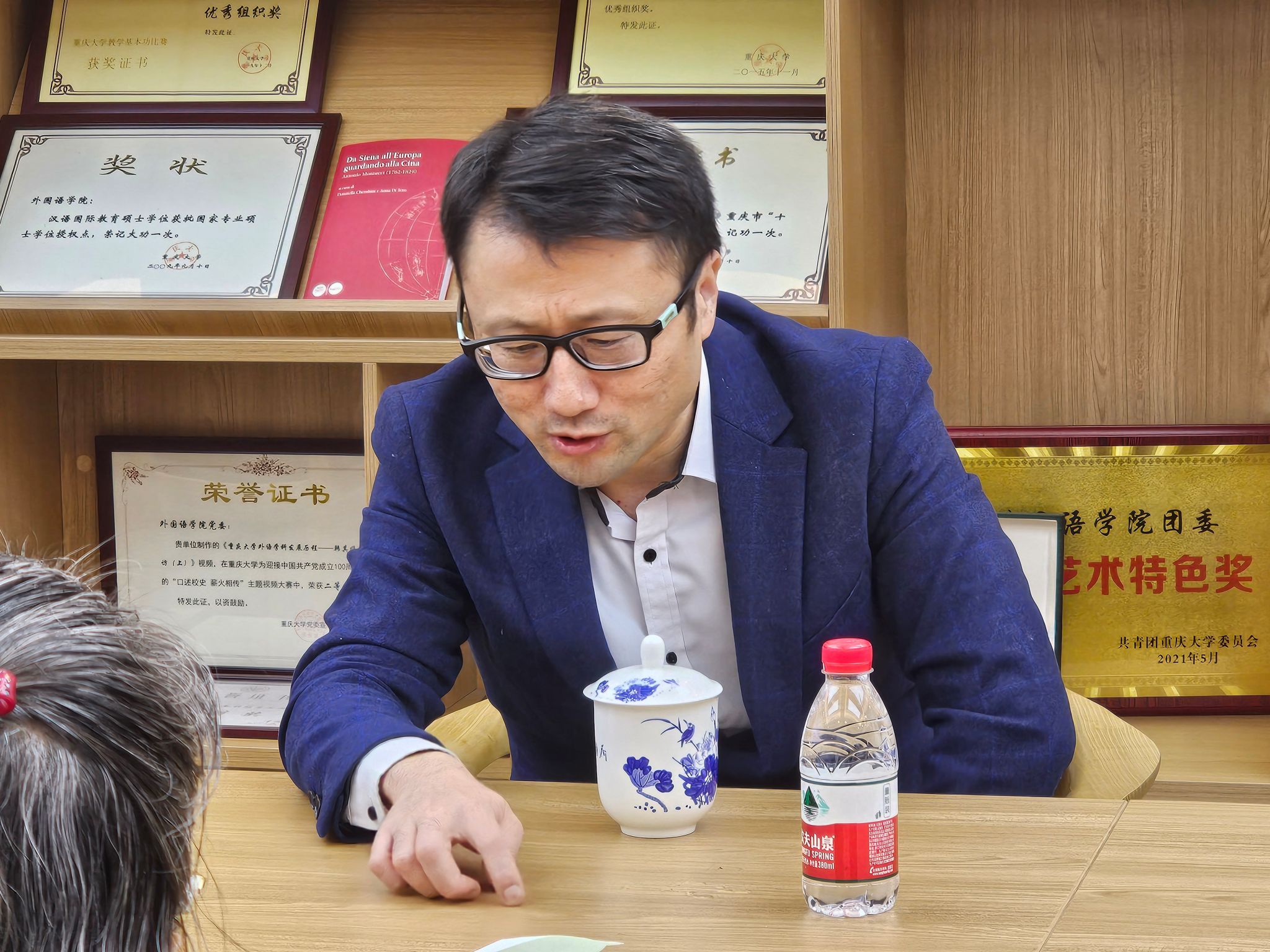 自2014年以来在线上课程建设、外语课程落实思政教育使命等方面的经验。他强调了以课程建设、教材建设带动教师发展,形成可持续的课程质量保障体系的重要性。
