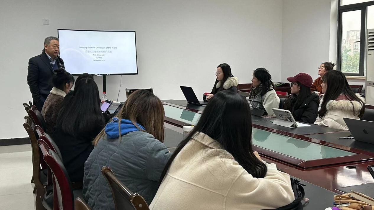 邀请香港中文大学(深圳)王立弟教授做了题为《迎接人工智能时代新的挑战》的翻译工作坊。翻译工作坊由晏生宏老师主持,2023级翻译硕士同学到场聆听。
