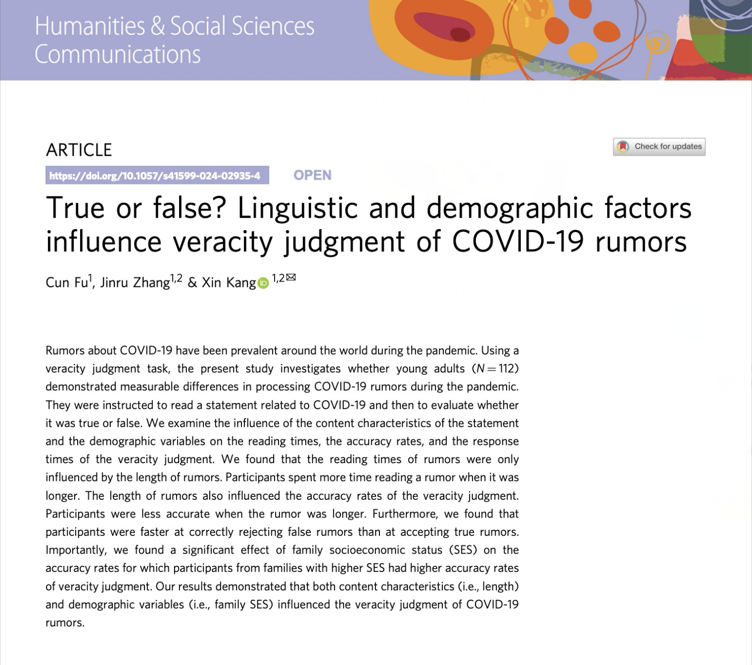 论文引用方式:Fu, C., Zhang, J., & Kang, X.* (2024). True or false? Linguistic and demographic factors influence veracity judgment of COVID-19 rumors. Humanities and Social Sciences Communications, 11(1), 1–7. //doi.org/10.1057/s41599-024-02935-4