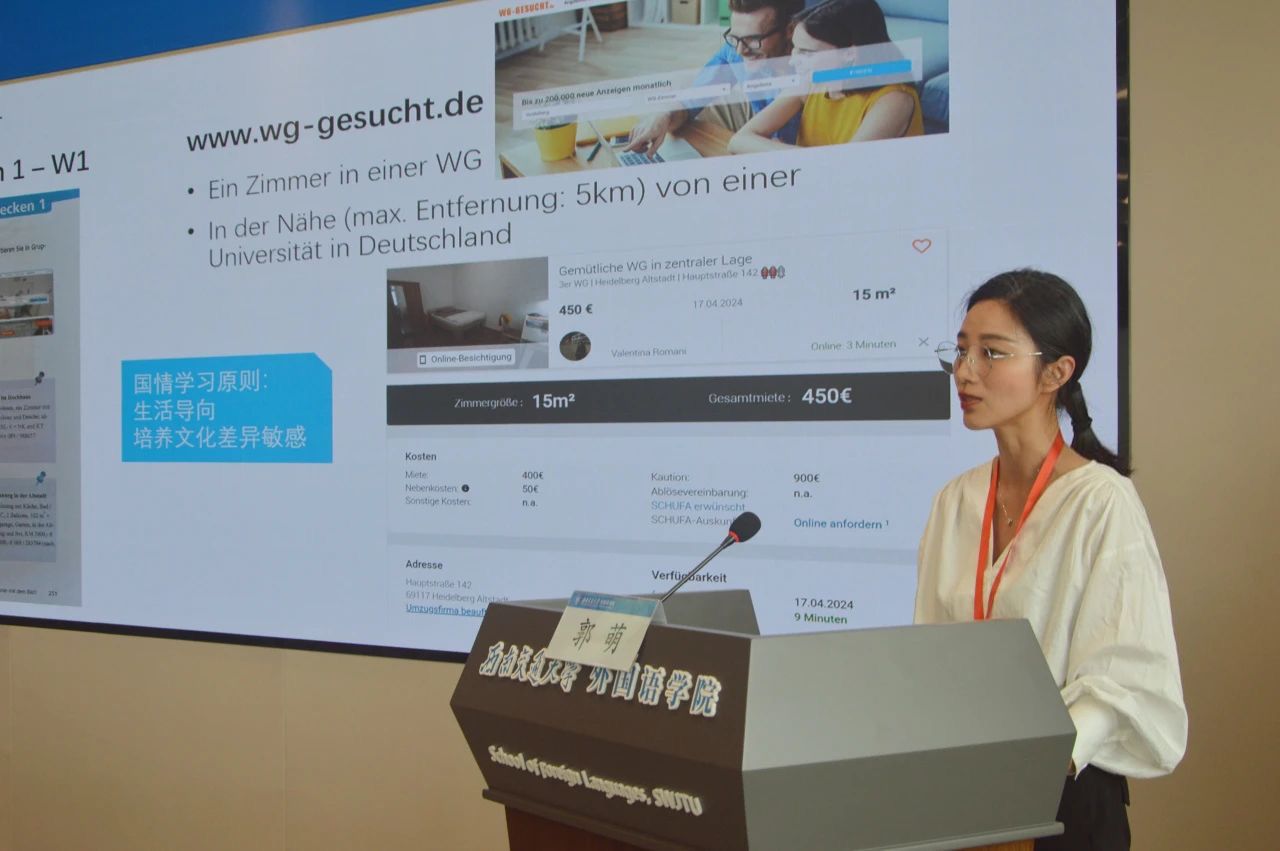 与外语教学与研究出版社联合承办的《新经典德语》课程设计与高等学校德语专业教学法研讨会在西南交通大学犀浦校区盛大举行,德语系教师郭萌代表我校在会上做了题为“整合式教学游戏与德语课堂的有机融合——以《新经典德语1学生用书》第六课为例”的专题报告。