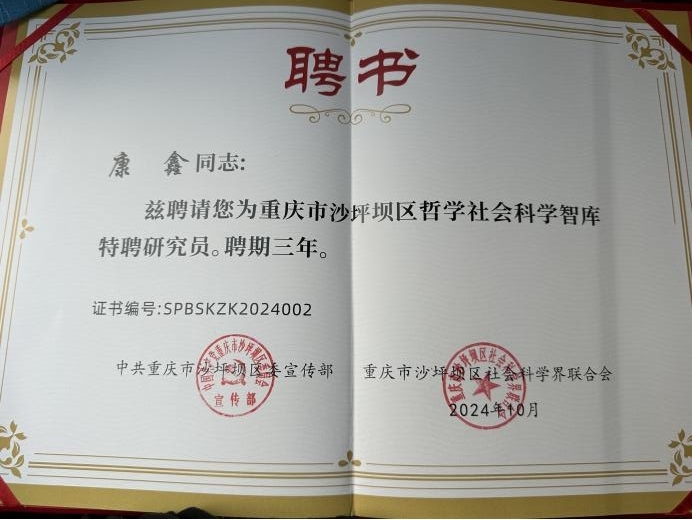 蒋婷、康鑫受聘为沙坪坝区哲学社会科学智库特聘研究员,徐晓川等人为135名特聘研究员颁发聘书。