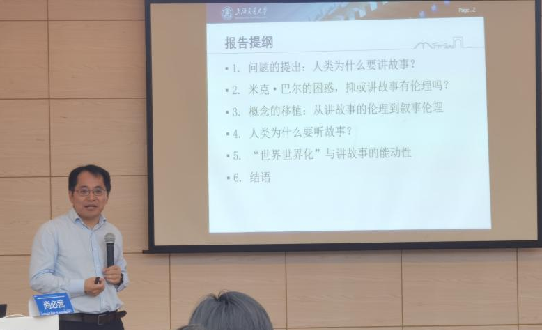 尚必武教授的讲座先回答了人类为什么要讲故事和讲故事是否有伦理的问题,阐释了从讲故事的伦理到叙事伦理的概念移植,指出了人类听故事的原因,进而分析了“世界世界化”的概念与讲故事的能动性。