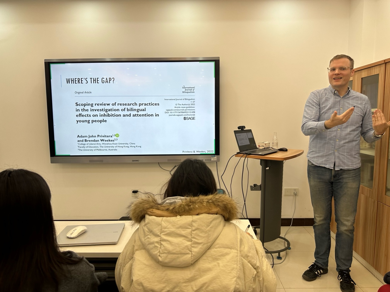 的资助,是“典型发展人群和特殊人群的语言加工与语言学习研究”全球前沿系列讲座(G-Seminar)之一。本次讲座由语言科学与障碍实验室(公众号CQU语言科学与障碍)的康鑫教授主持,在重庆市人文社科重点研究基地“语言认知及语言应用研究基地”开展,吸引到众多校内外师生参与。