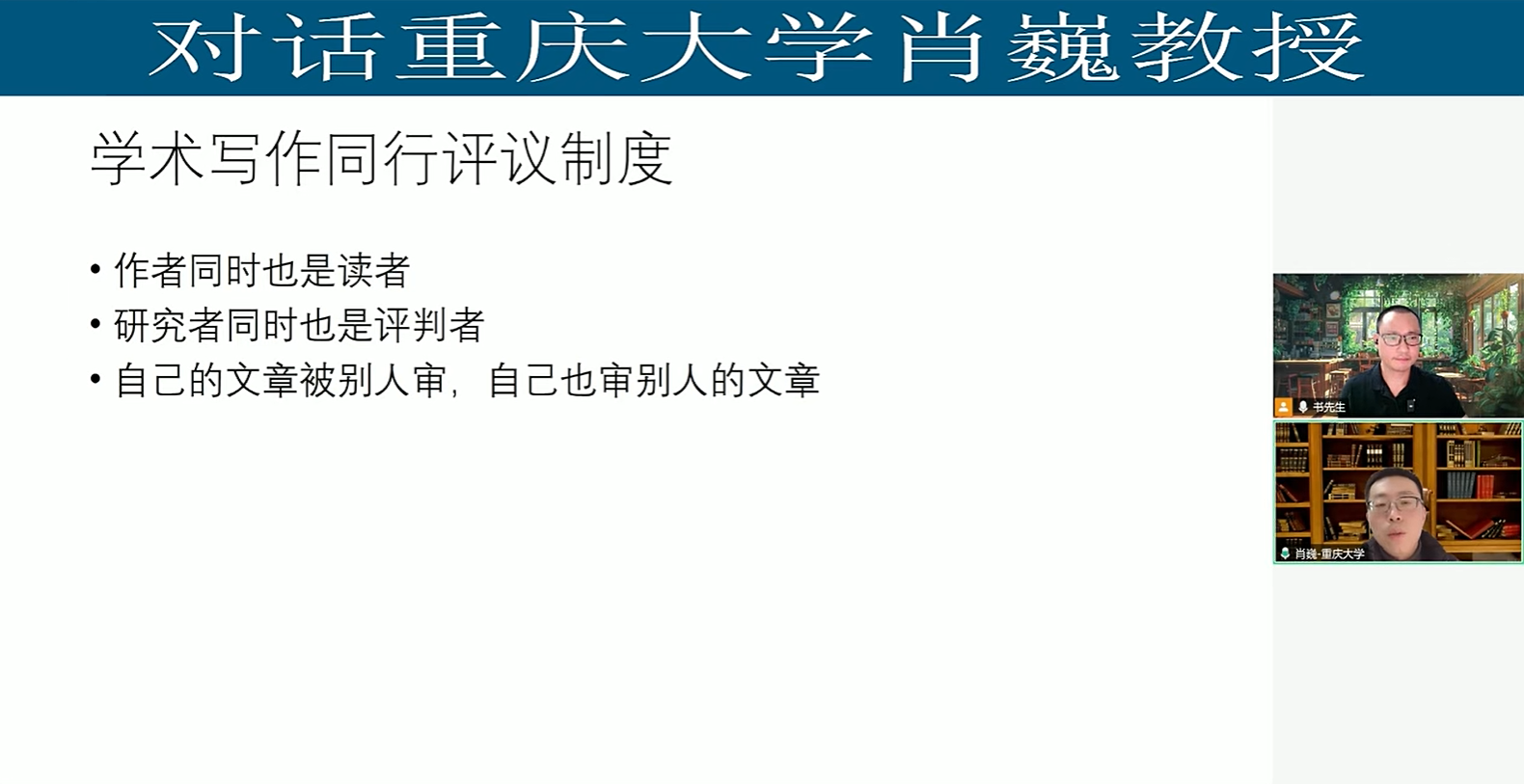 肖老师首先简单介绍了学术写作同行评议制度的特点,即:在学术圈,作者同时也是读者,研究者同时也是评判者;我们的文章会被别人审,同时我们也会审别人的文章。然后,肖老师分享了参与同行评议的几个好处:可以先睹为快,提前了解学术前沿;提升批判能力,帮助别人也帮助自己;体验开盲盒的乐趣,通过学习其他审稿人的意见发现自己的不足。肖老师号召青年教师如有机会积极参与审稿,以便从不同角度审视自己的文章;在读学生积极析出小论文投稿,以便获取反馈意见帮助自己提升毕业论文的质量。此后,肖老师分享了自己审稿的基本流程,并以自己参与审稿的一篇Lang Chen博士的文章为实例进行了审稿情景再现。作者Lang Chen博士与审稿人肖巍教授直接连线对话,将原始稿件、审稿意见及作者回复完全呈现在大家面前,就文章内容、审稿意见、作者如何回复进行了坦陈、充分的交流。最后,肖老师与Lang Chen博士就观众提出的问题进行了细致解答。此次讲座取得了圆满成功。