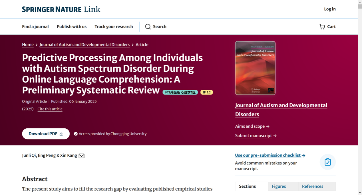 近日,我院彭静、康鑫教授共同指导的硕士研究生齐俊丽在享誉国际的孤独症领域期刊Journal of Autism and Developmental Disorders(JCR Q1;影响因子3.2)发表了题为“Predictive Processing Among Individuals with Autism Spectrum Disorder During Online Language Comprehension: A Preliminary Systematic Review”的研究文章。该论文的第一作者是我院2022级外国语言文学专业硕士研究生齐俊丽,彭静教授担任第二作者,康鑫教授为通讯作者。本研究受到了国家社会科学基金青年项目(22CYY021)、重庆市自然科学基金面上项目(CSTB2022NSCQ-MSX0494)和中央高校经费交叉研究培育项目(2022CDJSKJC02)的支持。