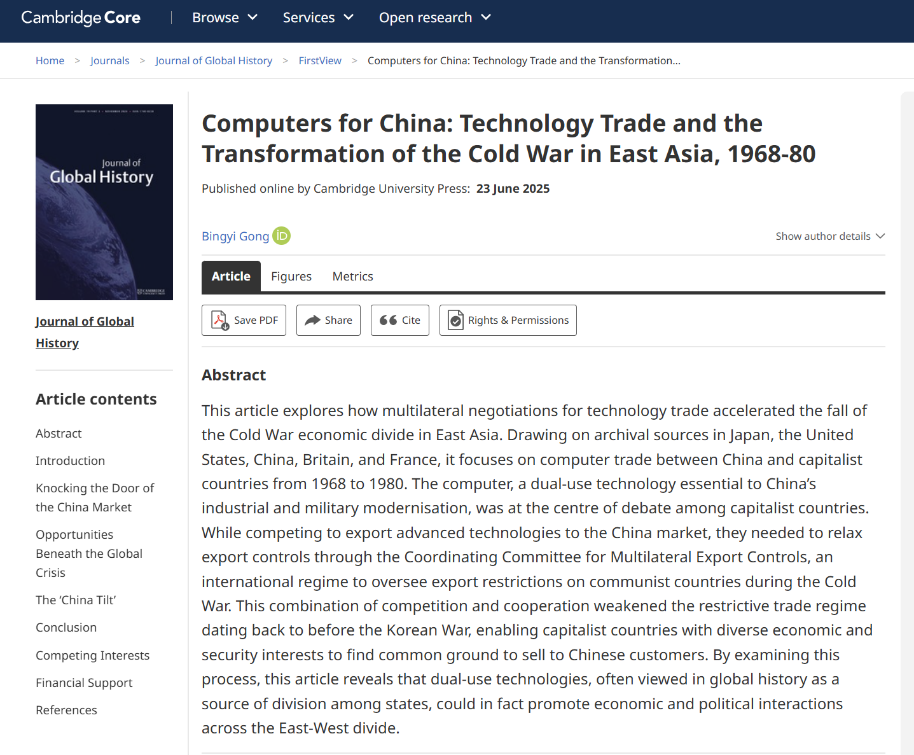 近日,我院日语系讲师龚冰怡在全球史权威期刊《Journal of Global History》上发表题为“Computers for China: Technology Trade and the Transformation of the Cold War in East Asia, 1968-80”的学术论文。该期刊由英国剑桥大学出版社(Cambridge University Press)出版,系SSCI和A&HCI双检索期刊,位列JCR历史学类一区,在跨区域研究、全球史、世界史等领域具有重要的学术影响力。
