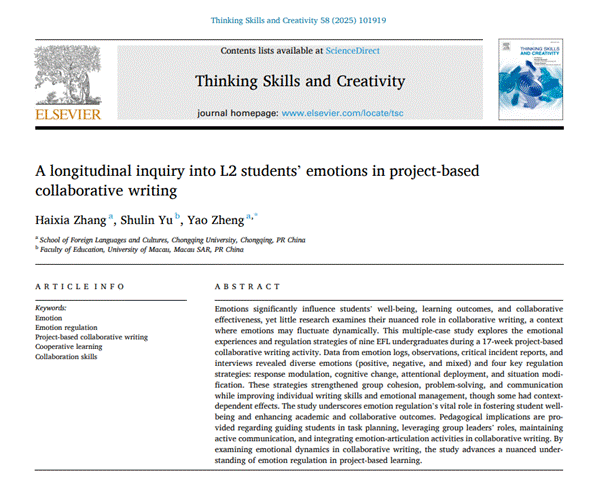 近期,我院英语系郑尧副教授团队的研究成果“A longitudinal inquiry into L2 students’ emotions in project-based collaborative writing”在Thinking Skills and Creativity期刊上正式发表。Thinking Skills and Creativity为SSCI收录的教育学领域重要期刊(SSCI一区,2024年影响因子:4.5,五年平均影响因子:4.9),重点关注思维方式创新与创造力研究方面的国际前沿成果。该文是郑尧主持的国家社会科学基金项目“积极心理视域下中国外语学习者多语写作投入的多维度动态研究”(21CYY018)的阶段性成果,第一作者为我院2024届硕士研究生张海霞,第二作者为澳门大学教育学院于书林教授,郑尧为第三作者及通讯作者。