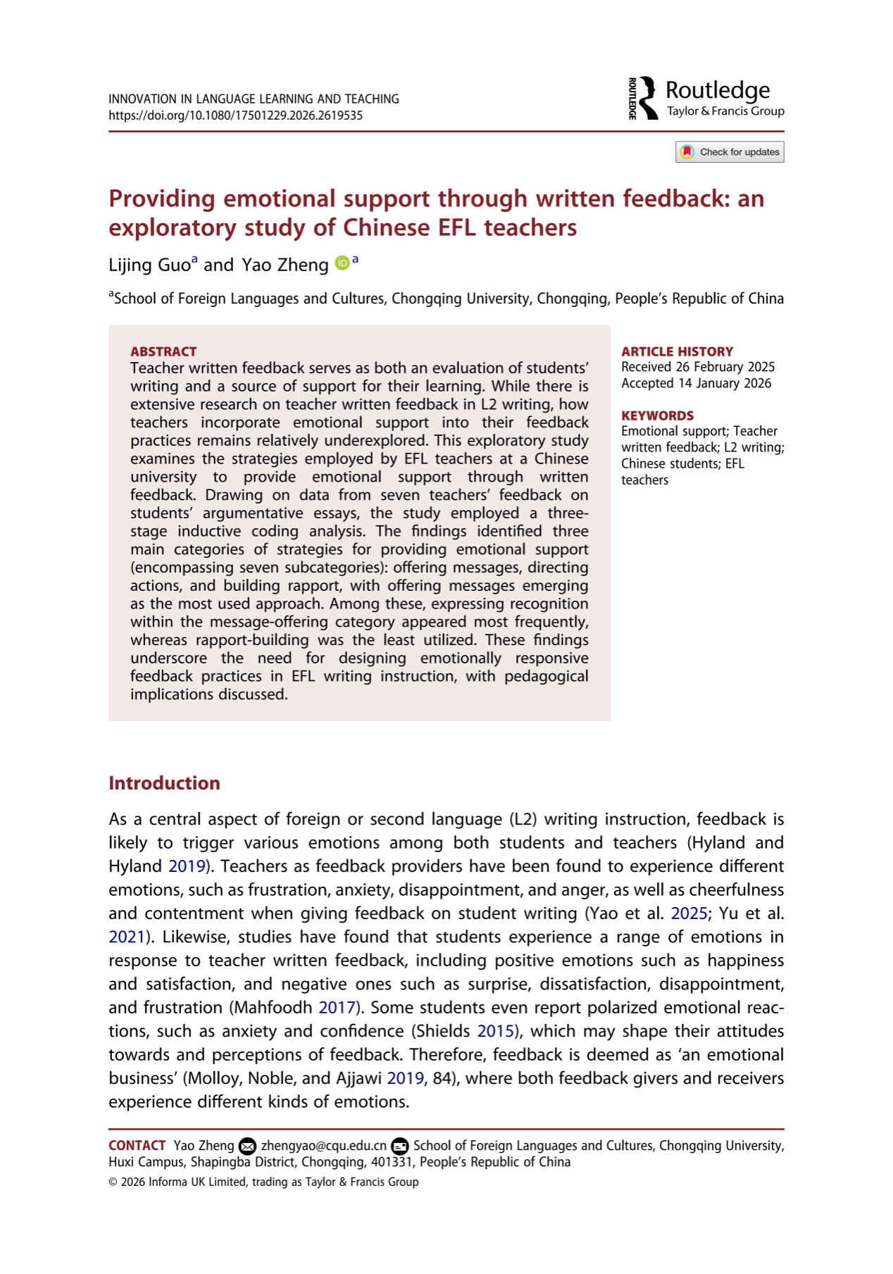 近期,我院二语写作教研团队的研究成果“Providing emotional support through written feedback: an exploratory study of Chinese EFL teachers”见刊于Innovation in Language Learning and TeachingInnovation in Language Learning and Teaching为SSCI收录的语言学重要期刊(JCR SSCI一区,2024年JCR影响因子:4.6,五年平均影响因子:4.5),是语言教育领域的国际高水平期刊之一。我院郭丽静老师为本文的第一作者,郑尧副教授为本文的第二作者及通讯作者。