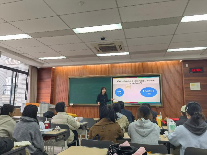 17日下午,宾德博士以“如何将短篇小说融入德语教学?——以《人们得保持年轻》为例”为题作首场讲座。她首先介绍了将短篇小说应用于对外德语教学的意义和相关理论基础,随后借助一篇短篇小说并以一个课时为例,详细演示了如何进行教学设计和开展课堂活动。讲座不仅训练了同学们的德语能力,也进一步激发了同学们对对外德语教学法理论与实践的学术兴趣。