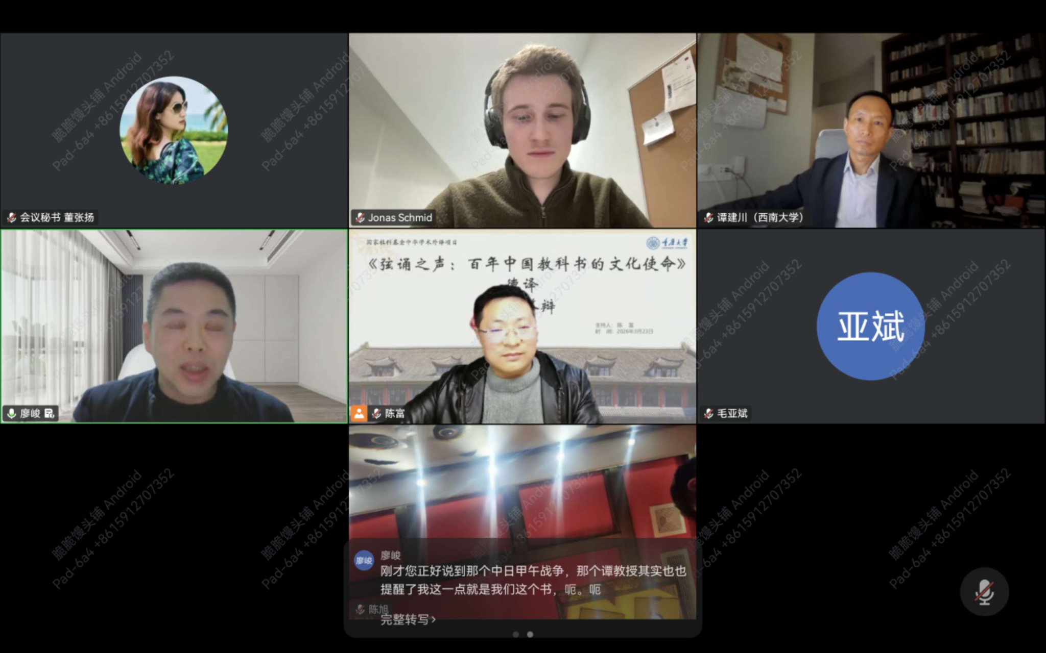 陈富老师主持的国家社科基金中华学术外译项目《弦诵之声:百年中国教科书的文化使命》德译开题答辩会顺利举行。四川外国语大学德语学院院长廖峻教授、西南大学教育学部教授谭建川教授、德国图宾根大学亚洲与东方学院汉学项目研究员Schmid博士担任答辩专家,社会科学处副处长吴永求教授、湖南教育出版社版权代理人陈旭先生出席会议。