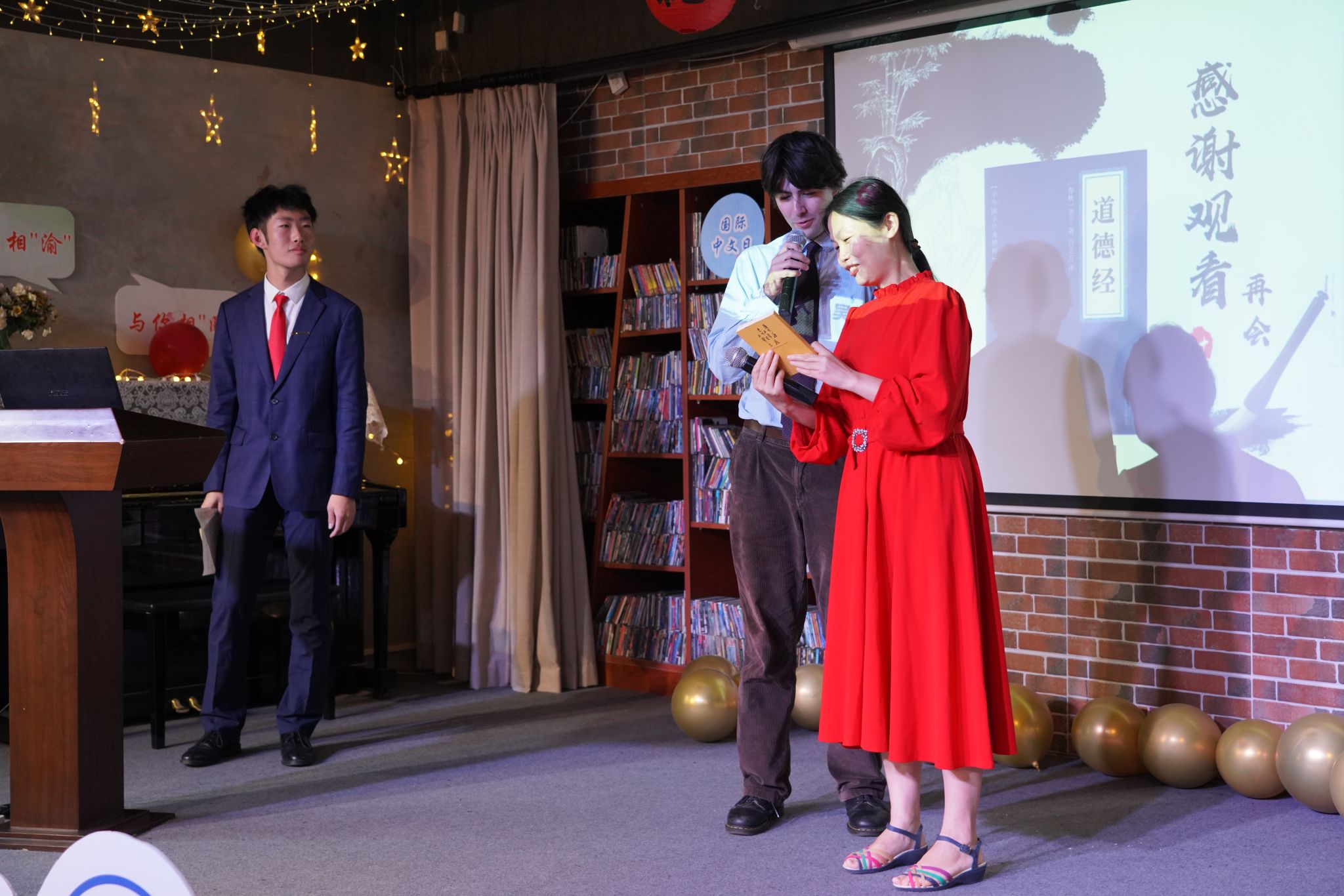 活动开场环节,大屏幕循环播放往届活动精彩回顾。留学生同学表演了朗诵经典散文《老海棠树》,深情的演绎为全场注入了温暖的书香气息。