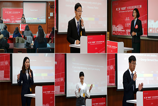 虎溪校区参加了第二届“卓越杯”大学生英语演讲比赛复决赛。西北工业大学罗鑫、大连理工大学梅琳涵分别夺得大学外语组和英语专业组的冠军。我校2017级英语专业张菁淳位居英语专业组第二名并荣获一等奖,英语专业的翟诗文获得二等奖;葛屹、郑雨馨获得大学英语组的二等奖。