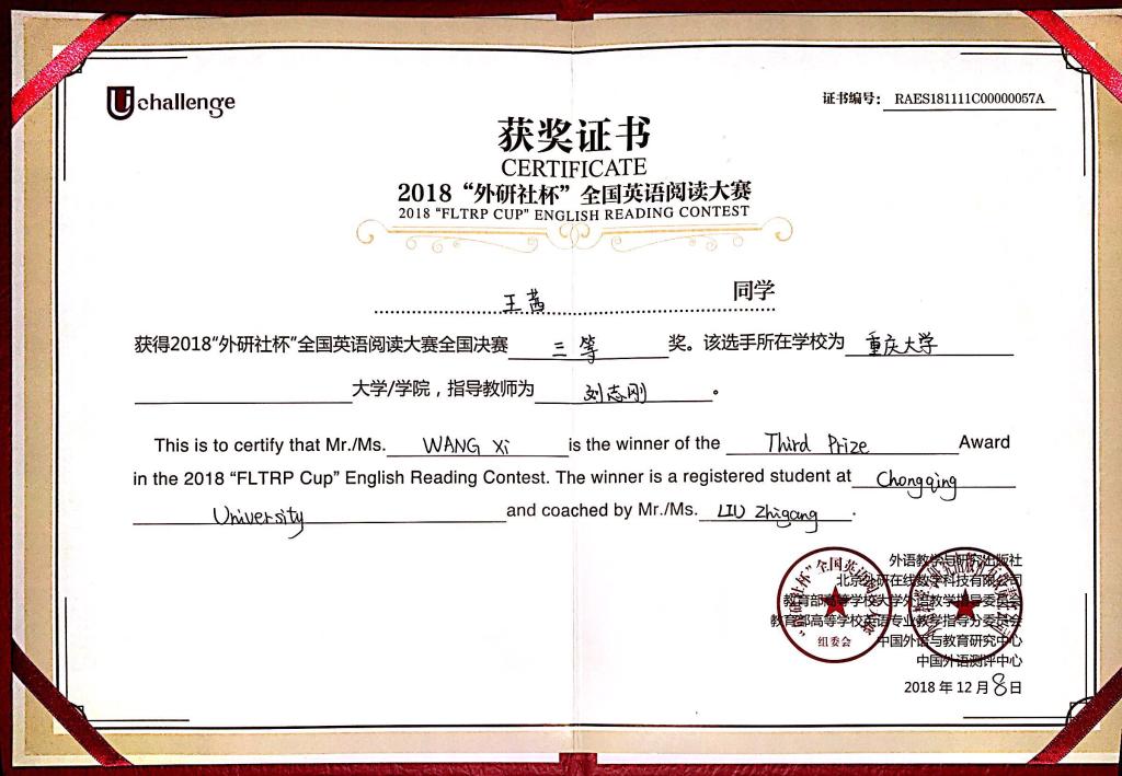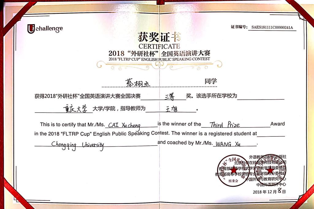 2018年12月9日,“外研社·国才杯”全国英语演讲、写作、阅读大赛总决赛在北京落下帷幕。来自全国30个省、市、自治区和香港、澳门特别行政区以及多国在华留学生共193名,分6个场次展开激烈角逐。我校两名选手从激烈的省赛中脱颖而出,代表重庆市参加了本次总决赛,其中城市建设与环境工程学院的蔡栩丞以其细腻的表达、缜密的思维、新颖的角度和独特的台风荣获演讲比赛全国三等奖,王旭获得指导教师三等奖;色情影片