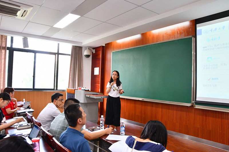 第五位助教何曦以《“翻转”英语课堂中的学习助手》为题,从线上工作到线下工作,围绕SPOC学习平台和班级英语学习评价表总结了她的助教工作。其线上工作特色之一是每周星期天晚上6:30-7:30进行的固定线上讨论活动。线下课前、课中、课后的工作围绕英语学习评价表中的各项内容为基础进行展开,以每周一课前20分钟与学生的面对面交流为重心,协助老师,发展学生的语言应用能力和批判性思维能力。