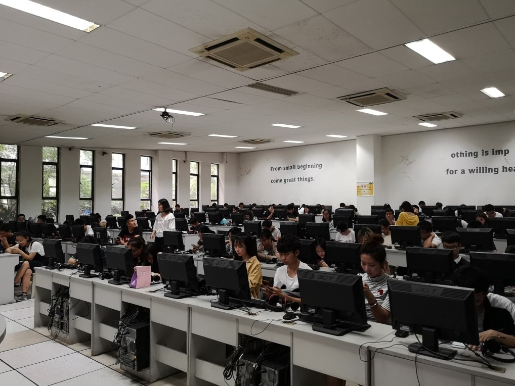 虎溪校区综合楼语言实验室参加了本次比赛。在45分钟的竞赛过程中,整个赛场秩序井然,每位参赛选手都认真思考、努力答题、力争发挥自己的最佳水平。