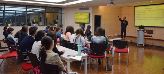 下半场讲座,胡焕阳老师辅以现场快板表演,依次具体地介绍了快板中小板的五个点、大板的五个声、大小板配合等不同的快板的基本打法;走向听众席,指导学生尝试快板的基本打法。中外学生在胡老师生动、欢快的快板表演气氛的感染下,积极拿起快板尝试。在胡老师和搭档的耐心的指导下,学生们勇敢尝试并掌握了几个简单的快板打法,讲座现场的气氛在片片清脆的快板声中达到热烈的高潮,学生们对快板这种艺术形式表现出了极大的兴趣。