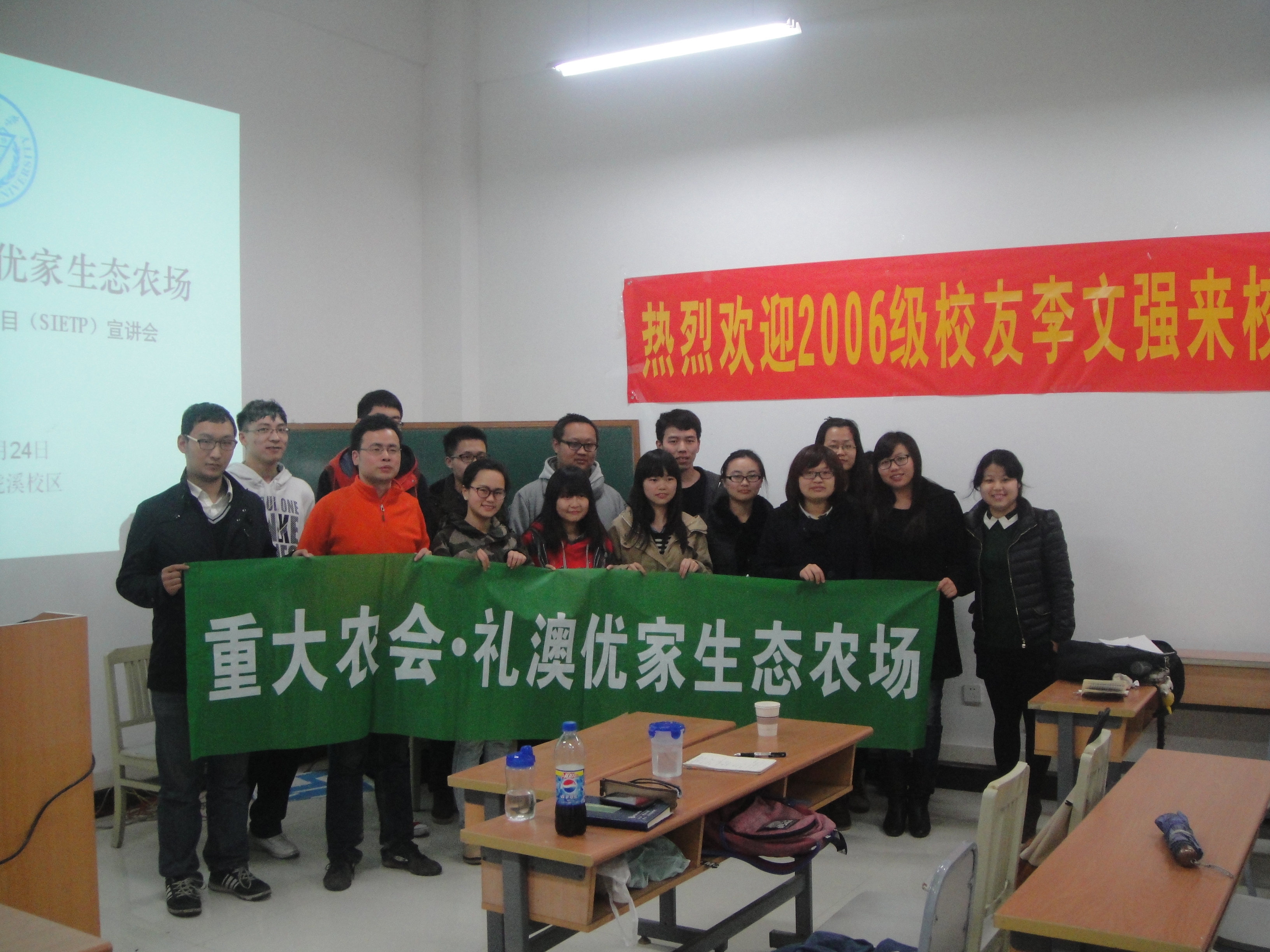 李文强学长自2010年毕业后在银行、房地产等地做过销售职业,但在工作中一直怀着一颗年轻跳动的心,不甘于平凡的他却始终放不下他的创业梦想。一次偶然机会让他发现了CSA社区支持农业这个新项目,经过多番考察认为这个项目具有社会和经济的双重效益,创业的想法如种子般在心中破土而出。因为有着大学几年的实习经验,使他对自己的创业信心满满,再加上学校SIETP项目团队的支持与重庆市对大学毕业生创业的支持,礼澳优家洪湖生态农场就此诞生,李文强学长的创业之路就轰轰烈烈地展开了。