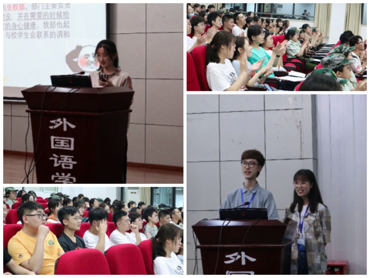 接着,团委学生会各个部门、挂靠在学院的各校级社团、学院内各院级社团的宣讲人依次上台进行了宣讲发言。各位宣讲人主要围绕着团队成员介绍、机构部门简介、风采展示三个方面,结合组织自身的特色,向新生们进行了详尽的宣讲。台上宣讲的学长学姐们借助了诸如相声的表演形式,使用英语、日语、德语等外语演讲方式,以及结合表情包、快闪视频、广告单等内容呈现样式,严肃不失幽默、有趣而不失严谨般地吸人眼球、引人关注,使得现场的学弟学妹们笑声不断,掌声雷动。