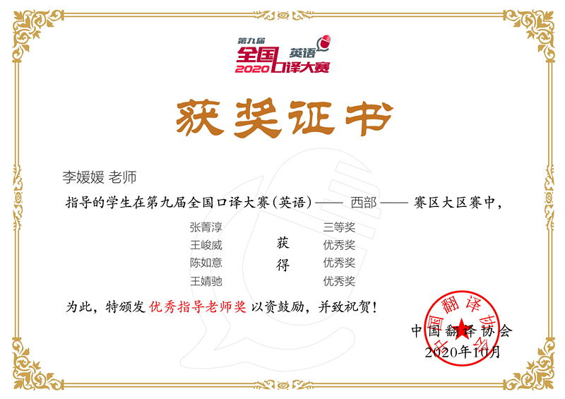 第九届全国口译大赛(英语)从初赛至大区赛三个阶段,遵循国家疫情防控大方针要求,全程实行线上选拔与参赛,历时4个月,我校累计评获奖31项。在校初赛阶段,我校从报名的100多人中筛选出57人参加比赛,评选出14名获奖选手,并从中推选出11名学生参加省市级复赛;在复赛中,荣获一等奖的2位选手和荣获二等奖的3位选手又凭借突出表现晋级至大区赛。在整个竞赛过程中,选手们获得个人奖项的同时,也为色情影片