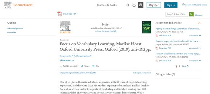 辜向东教授与其团队成员曾长萍合作并撰写的书评Focus On Vocabulary Learning在SSCI期刊System上在线发表!辜教授认为学术起步从书评写作开始,指导并与学生联合发表书评是提升硕士生学术素养和培养21世纪人才人生胜任力的一种有效途径。