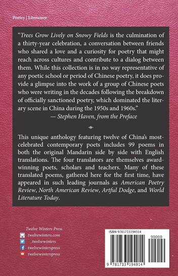 2021年2月,我院李永毅教授与美国诗人Stephen Haven等人合译的中国当代诗选Tree Grow Lively on Snowy Fields由美国文学出版社Twelve Winters Press出版。这部诗选是三位中国译者与Haven教授在数十年的友谊中合作完成的,收录了99首诗,汉英对照出版。入选的诗人包括郑敏、北岛、多多、芒克、王家新、童蔚、莫非、蓝蓝、余怒、杨键和唐丹鸿。李永毅教授与Haven教授合作翻译了其中的49首,另外他自己的作品《天命》(Destinies)组诗也收入书中。