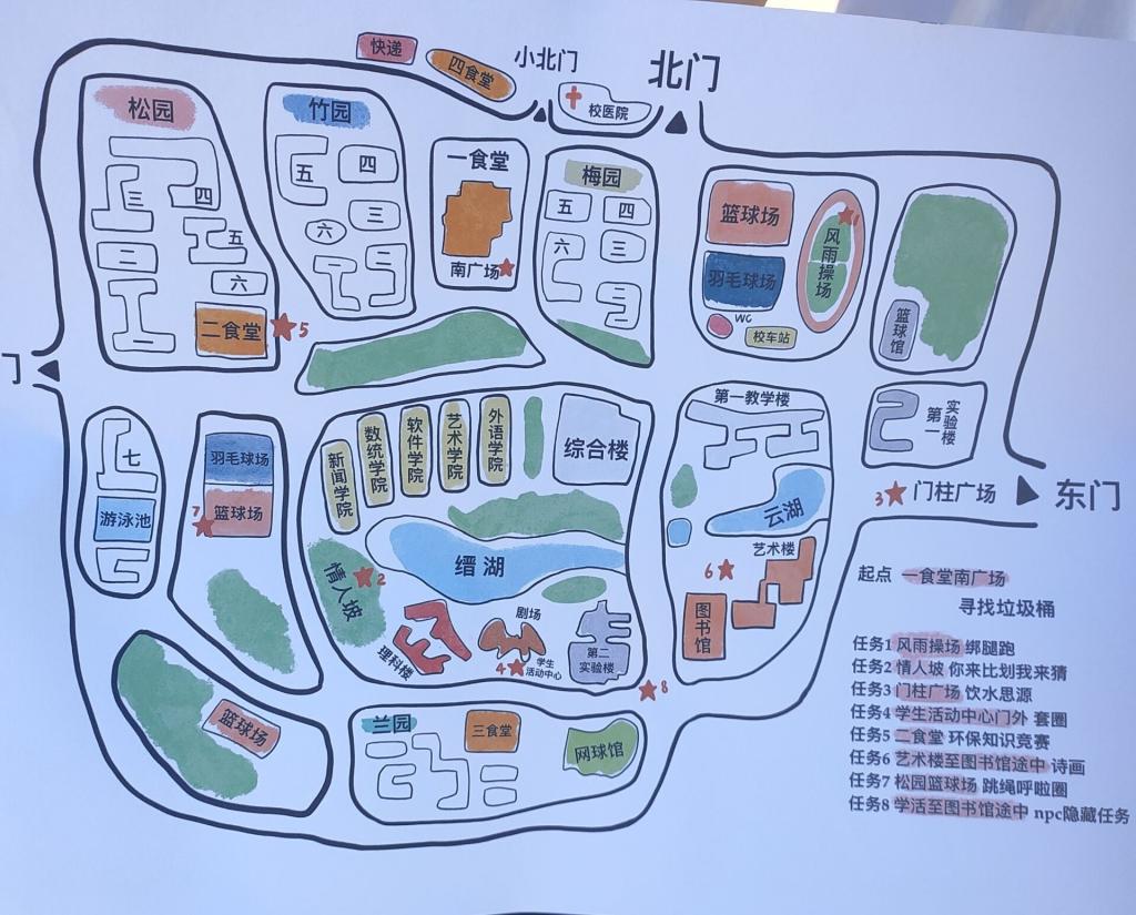 唐仲英爱心协会于2021年5月16日举办了“爱无限,绿无边”主题趣味环保大作战活动。本次活动以丰富的游戏、独特的方式吸引了很多同学前来参与。活动以组队游戏的方式开展,同学们四人一组从一食堂南广场领取任务后出发,任选六个任务完成后返回起点,同时各队需要在游戏的全程中寻找特定的位置进行合影。下午14点各个队伍依次开始环保之旅。