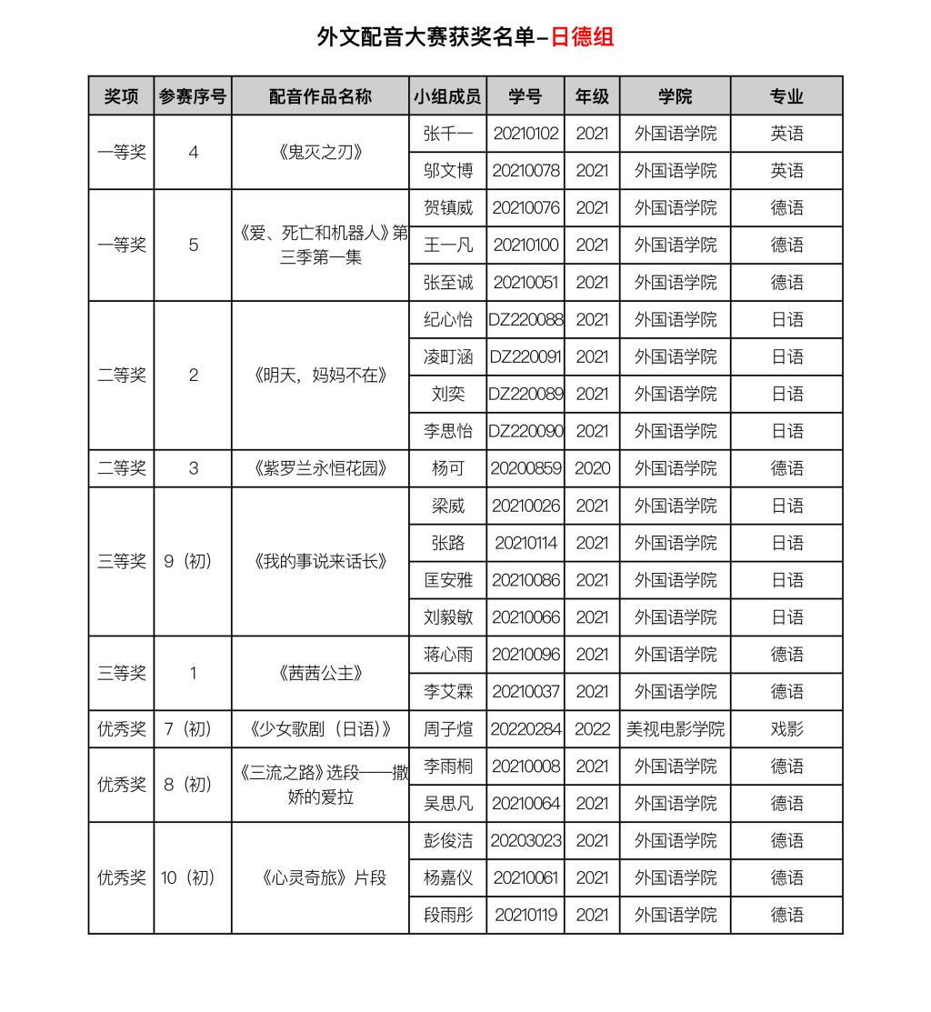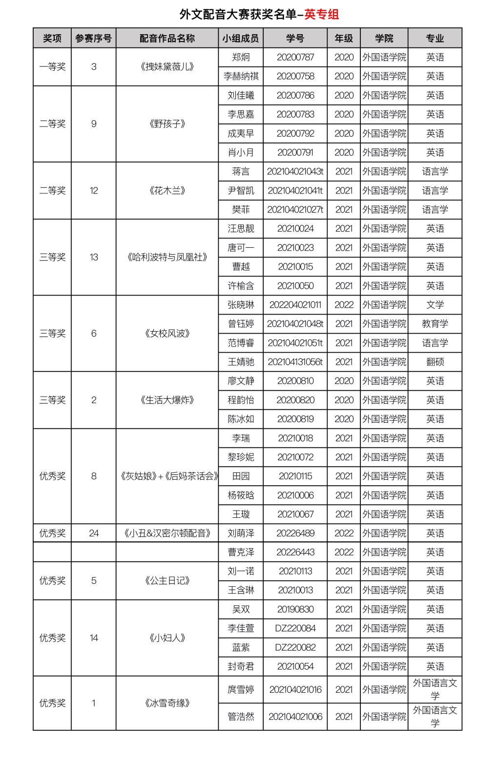 由色情影片 主办、色情影片 承办的色情影片 第二十二届外语文化节系列活动之外文配音大赛已经结束。赛事自11月9日启动以来,吸引到全校近15个学院、29个专业的60支队伍前来参与,评选出29个获奖组74名获奖选手。其中,英语专业组共11个获奖组35名获奖选手,公共外语组共9个获奖组17名获奖选手,日语德语组共9个获奖组22名获奖选手。 现将外文配音大赛获奖名单进行公布。