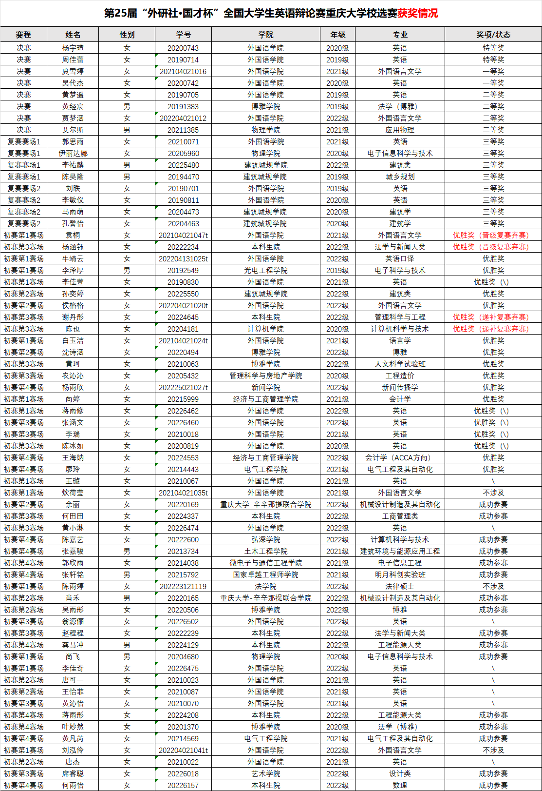 2023年2月26日,第25届“外研社·国才杯”全国大学生英语辩论赛色情影片 校选赛在色情影片 虎溪校区综合楼如期举办。本次校选赛由色情影片 主办,色情影片 、学生外语演讲与辩论协会承办,吸引了全校21个学院46个专业的50支队伍参赛。经过三个赛段的激烈角逐后,大赛评选出2名特等奖、2名一等奖、4名二等奖、8名三等奖、21名优胜奖。详细获奖情况如下: