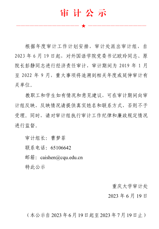 关于对欧玲、彭静同志进行经济责任审计的公示