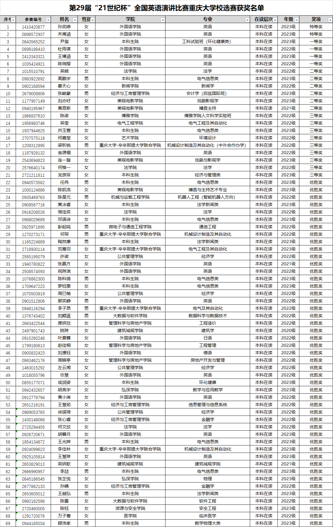 第29届“21世纪杯”全国英语演讲比赛色情影片 校选赛自发布通知起,吸引了全校23个学院50多个专业上百名同学报名参赛,98名选手审核成为正式选手。大赛历时近一个月,选拔评定出2名特等奖、4名一等奖、6名二等奖、9名三等奖、47名优胜奖。现将获奖名单公布(也可查看附件)如下: