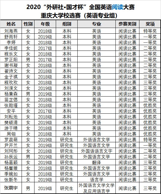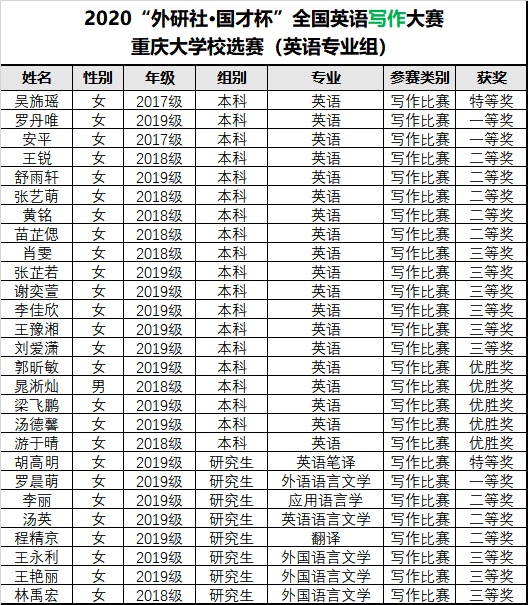 英语专业本科组、英语专业研究生组校选结果出炉。两大赛事经由英语竞赛团队老师出题、阅卷以及评审等环节,最终评定出50名奖项。在写作比赛中,本科组共评选出特等奖1名、一等奖2名、二等奖5名、三等奖6名、优胜奖5名,研究生组共评选出特等奖1名、一等奖1名、二等奖3名、三等奖3名;在阅读比赛中,本科组共评选出特等奖1名、一等奖2名、二等奖5名、三等奖6名、优胜奖5名,研究生组共评选出特等奖1名、一等奖1名、二等奖3名、三等奖3名。具体结果公示如下:
