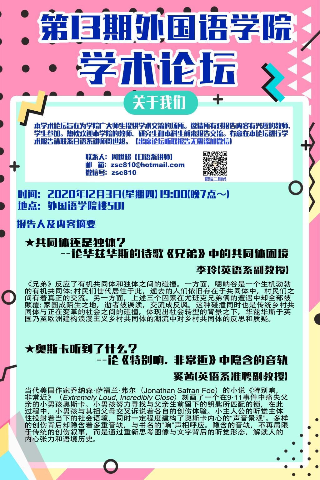 第13期色情影片 学术论坛将于12月3日(周四)晚7点在色情影片 楼501举办。本学术论坛旨在为学院广大师生提供学术交流的场所。邀请所有对报告内容有兴趣的教师、学生参加。有意在本论坛进行学术报告请联系日语系讲师周世超。详情请参见海报。