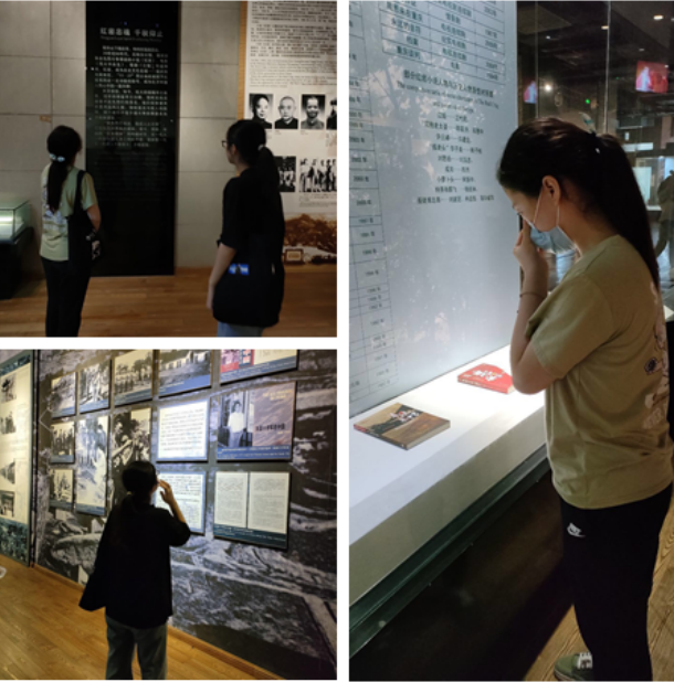 陈列馆展示的珍贵文物包括江姐原型人物在川东进行革命工作时使用过的皮箱、红岩烈士们生前在监狱里绣制的一面五星红旗、《挺进报》原件、杨虎城将军生前所穿军装、佩剑等等。通过陈列馆中的先烈文物展示、文字图片的描述,实践团成员完整地了解了小说《红岩》的创作历程,以及在渣滓洞、白公馆关押时期先烈们的艰苦生活与斗争,进一步走进了红岩时期,感悟到了红岩精神的力量。值得一提的是,在参观过程中,实践团成员们发现那些于“11·27大屠杀”牺牲的烈士们,有不少正值二十的大好年华,他们在生前为了革命、为了解放艰苦斗争,入狱后也依旧初心不改,坚持反蒋和地下革命的同时,不忘身为青年的本职,在监狱如此恶劣的环境下仍然坚持写作、苦学知识,怀揣着对于革命的必胜之心与学习的高度热情。这份坚忍不拔的革命精神,使同样身为青年学生的实践团成员大受震撼,更是为当代青年学子树立了优秀的榜样,启示我们在新时代也要学习这份刻苦学习、不懈奋斗的精神,为社会主义现代化建设与革命贡献出属于我们青年的力量。