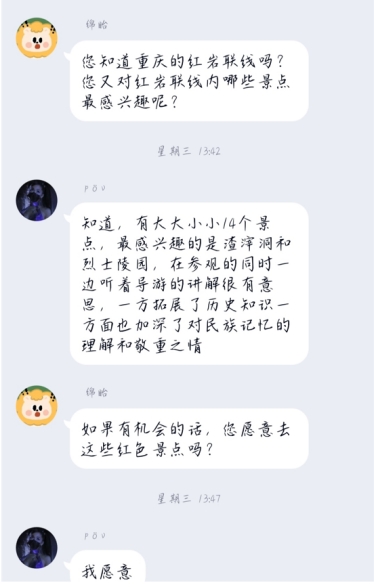 随后,实践团成员继续采访到,“重庆作为抗日战争时期的陪都,抗战和解放战争期间,涌现了许许多多为人民解放而奉献牺牲的革命烈士,更诞生了红岩精神的伟大精神财富,请问您对重庆红岩联线有着怎样的了解呢?