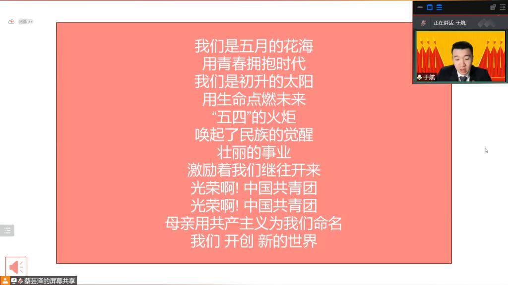 会议伊始,主持人于航同志带领与会人员齐唱共青团团歌。在悠扬的歌声中会议进入第二项,院团委书记汪俣婧老师宣读上级团委文件《关于开展色情影片