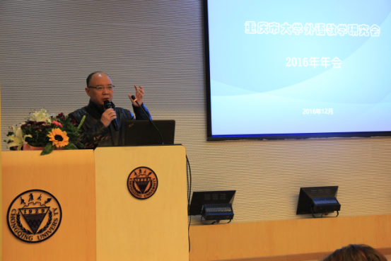 高教处处长蒋后强在致辞中对外语教育进行了剖析,并提出了自己的一些见解。蒋处长指出高校强调高素质人才培养,而外语除了可以用来学习、交流先进的科学技术或专业信息之外,还要了解国外的社会与文化,培养跨文化交流的能力,因此外语课程是工具性和人文性的统一;同时学生的外语能力也是当代高等教育深化创新创业教育改革的重要推动力,外语能力决定着我们的学生将来能够走多远,发展潜力有多大。最后蒋处长希望重庆市大学外语教学研究会在组织相关学生外语活动、教师教学能力提升活动外,还应考虑如何更好地支持教师的教学研究,教学与研究相辅相成,真正地促进外语教师队伍的发展。