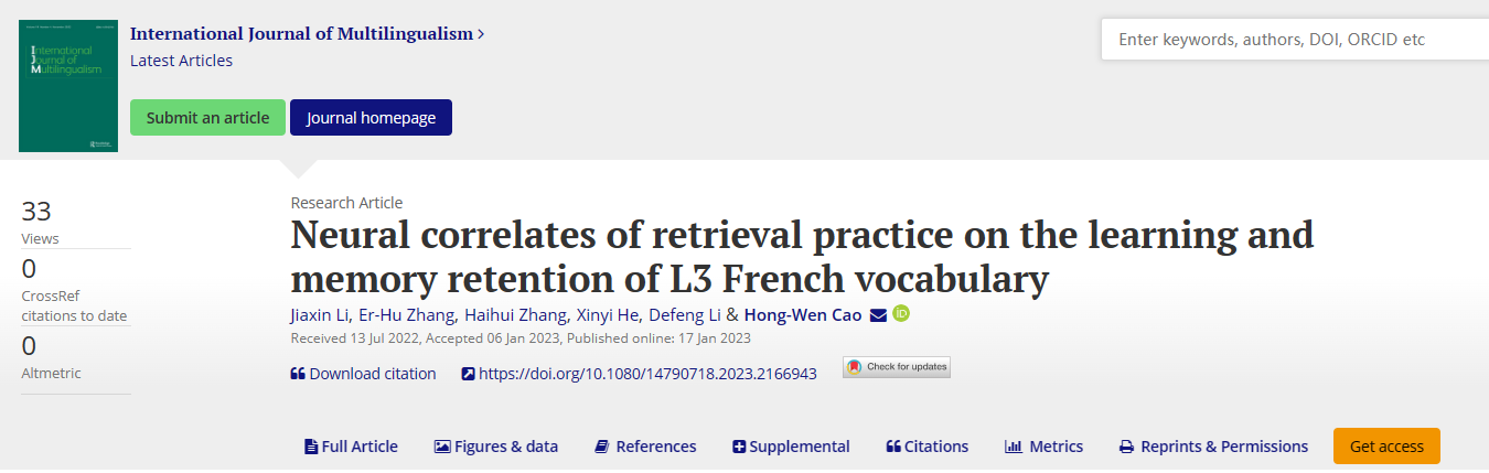 近日,我院曹洪文老师团队在英国泰勒-弗朗西斯出版集团(Taylor & Francis Group)旗下国际多语现象研究领域顶级期刊《国际多语期刊》(International Journal of Multilingualism,SSCI和A&HCI双检索,Q1)上发表题为“Neural correlates of retrieval practice on the learning and memory retention of L3 French vocabulary”的研究论文。该论文第一作者为我院语言认知与脑科学方向2020级博士生李佳欣,通讯作者为色情影片