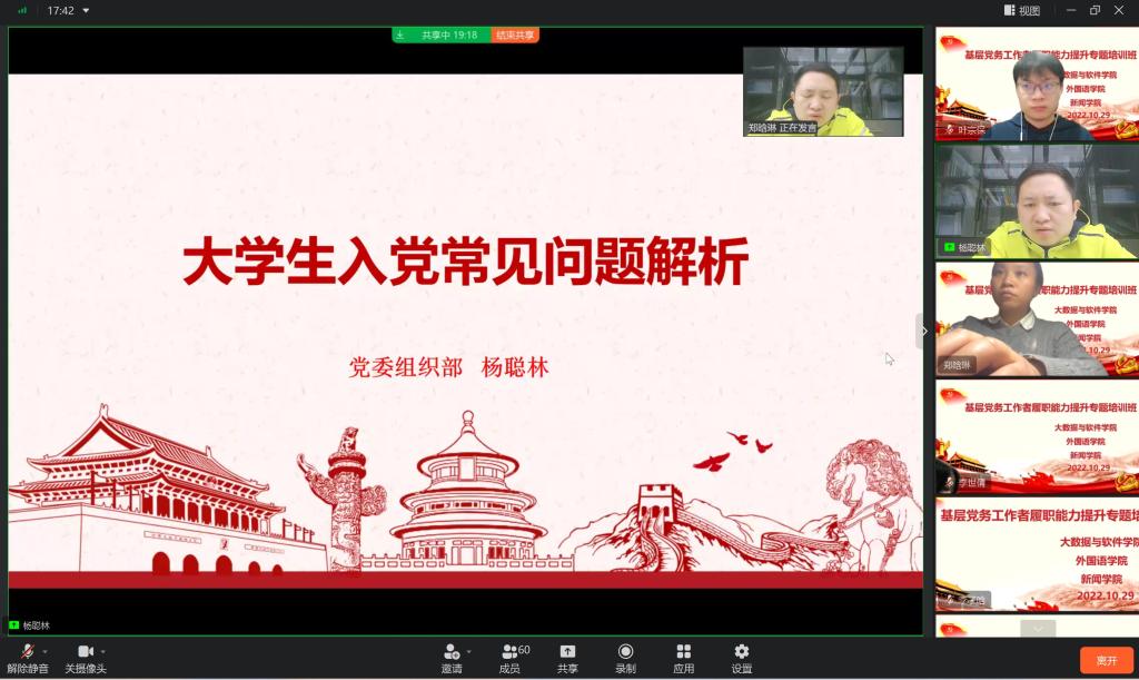 、大数据与软件学院和新闻学院采用线上会议的方式联合开展了“基层党务工作者履职能力提升专题培训班”第二讲。会议由大数据与软件学院党委组织员郑晗琳主持,来自大数据与软件学院、色情影片